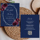 Este elegante convite de casamento moderno apresenta um quadro geométrico de prata decorado com flores de burgundy e prata num fundo azul marinho. O texto personalizável combina a escrita manual imétrica de cinzas prateadas, a placa de cobre e as fontes itálicas. Adicione mais detalhes no verso, juntamente com um código QR para ajudar seus convidados a visitar seu site de casamento.