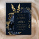 Este elegante e meloso convite de casamento apresenta um buquê floral romântico e luxuoso em azul marinho com folha de ouro e folhagem brilhante num fundo azul escuro. Personalize o texto dourado em fontes na moda em um retângulo escuro. O verso é azul escuro sólido.