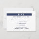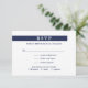 O RSVP de casamento moderno da China apresenta texto azul marinho minimalista em um fundo branco na frente com opções de menu personalizáveis. Perto do topo está uma linha de marinho horizontal que passa a maior parte do caminho com as letras RSVP em dentro branco. Personalize o texto na barra lateral. O dorso é azul escuro com listras brancas que não se estendem por todo o lado. As linhas formam um padrão geométrico ondulante. © Claire E. Skinner, Todos Os Direitos Reservados.