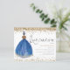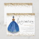 Marinho Glitter Gown Girl Quinceanera Convite. Um alternativo de 4,5 pol x 5,6 pol com preço inferior. Disponível em um STOCK DE CARTÃO SEMI GLOSS 110 lb, que é a opção padrão (recomendada para convites), OU um STOCK DE PAPEL THINNER SATIN FINISH 80 lb (ideal para gabinetes). Os envelopes são um extra opcional e são ligeiramente maiores que o tamanho da placa. elegância esparsa para a sua Quinceanera com uma ilustração da visão de trás de uma garota de cabelos escuros em um belo vestido de bola de marinho e brilho dourado nos bordos superior e inferior de cada lado. O cabeçalho principal está em um script de estilo de escrita manual definido e personaliza facilmente o resto do texto para seus detalhes.