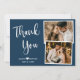 Cartões de agradecimentos de Colagem de Fotos de Casamento Branco, Elegante, Mínimalista, com Marinho de Manuscrito. modelo de cartões de agradecimentos multifoto do casamento na moda com duas (2) fotos na frente e uma (1) fotos no verso. Com o texto "Obrigado" em um bonito script de tipografia escrito à mão em branco sobre fundo azul escuro marinho. Personalize o nome personalizado e a mensagem do obrigado. Se preferir escrever manualmente a sua nota, basta eliminar o texto de amostra para obter mais espaço. Se precisar de ajuda ou item correspondente, entre em contato com o designer!