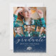 Convites modernos de festa de formatura com um fundo azul de marinho que pode ser mudado para qualquer cor, 4 fotos do formando, brilho elegante de prata falsa, um quadro de retórica e um modelo simples de celebração de formando que é fácil de personalizar.