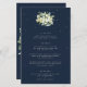 Um cardápio de casamento de três marinhos escuros, com um buquê/poste de groselhas pintadas manualmente e eucalipto na frente e uma coroa na parte de trás. Todo texto é totalmente editável e os pontos dispersos na frente e atrás podem ser excluídos antes de fazer o pedido, se preferir. Por favor veja esta Coleção na minha loja para menus com disposições florais de alternativo, um número diferente de cursos e em tamanhos/cores/formas diferentes. Itens de coordenação também disponíveis.