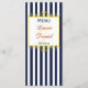 Este cartão de cardápio branco e azul-marinho inspirado em náutica, com rolhas amarelas e letras vermelhas corresponde ao convite de casamento mostrado abaixo. Ele foi projetado em uma placa de rack com uma frente brilhante e acabamento mate na parte traseira. Se quiser que um cartão de menu em papel de convite corresponda aos seus convites ou se tiver pedidos de itens adicionais ou alterações, envie um e-mail para niteowlstudio@gmail.com com a sua solicitação.