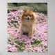 Fotografia da Pomerânia Cuta chamada Marley sentada no campo das Flores rosa.