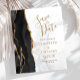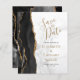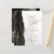 A borda esquerda deste elegante casamento moderno salve o cartão de data apresenta uma borda de agata preta aparada com falso brilho dourado. O texto personalizável combina manuscrito dourado, fontes em copperplate e itálico em uma cinza e fundo de mármore branco. O verso apresenta um design de agate preto e dourado correspondente.