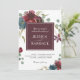 Flores florais de aquarelas artificialmente elegantes em marsala vermelha profunda, burgundy e marinho com galhos de eucalipto e armações verdes à deriva dos bordos deste convite especial ao casamento. Um quadro quadrado correspondente de marsala acrescenta um adorável pano de fundo aos nomes da noiva e do noivo. Personalize o modelo de texto fácil de usar com seus detalhes de casamento.