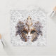 Uma máscara refinada apresenta detalhes de ornamentado com elementos dourados e brancos. O design simétrico incorpora padrões e embelezamentos intrincados que transmitem um sentido de elegância e mistério. A decoração do ornamentado da máscara sugere um cenário lento, adequado para uma bola de mascarada.