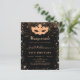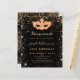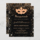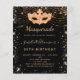 Para uma Mascarada elegante, aniversário de 50 anos (ou qualquer idade). Um fundo preto elegante. Decorado com pó de brilho dourado falso e uma máscara de mascarada. Personalize e adicione um nome, idade e detalhes da festa. O nome é escrito com uma fonte estilo letra manuscrita.