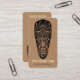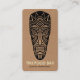 Um cartão de visita atrativo com um motif estilo Tiki Mask desenhado à mão e desenhado à mão, desenhado à mão, Nome da empresa e tipo de negócio na frente com nome e outros detalhes de contato no verso com três motivos de máscara de Tike.