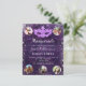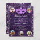 Para um Mascarada elegante, Quinceañera, 15 aniversário. Um padrão floral roxo profundo como fundo. Decorado com pó falso prateado brilhante e uma máscara de mascarada. Personalize e adicione 5 fotos, um nome, idade e detalhes da festa. O nome é escrito com um script de estilo manuscrito