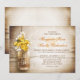 belos convites de casamento rústicos com fundo de madeira em apuros e jarro de pedras com flores amarelas e brancas. Convidado perfeito para o seu casamento no campo russo