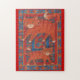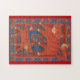 Um gato e um gatinho da marmalada parados sobre um tapete vermelho, azul e amarelo com temática de peixes. Quebra-cabeça de quebra-cabeça com um design personalizável para você personalizar com seu próprio texto, imagens e ideias. Um desenho de lápis colorido original de Jess Perry.