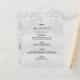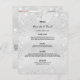 Um cartão de cardápio de casamento elegante e glamouroso. Personalize e adicione seus nomes, data e menu de casamento. Fundo metálico de aspecto fino prateado, decorado com poeira falsa brilhante. Traseira: pó prateado e brilhante, sua foto e adicione sua história de amor. Dê às pessoas algo para falar enquanto espera que a comida seja servida!