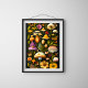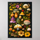 O poster impressão apresenta flores coloridas, cogumelos e borboletas que se pode encontrar num campo penteado no Primavera. A IA botânica gerou pintura digital em estilo Haeckel moderno.