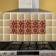 Este azulejo de sotaque decorativo apresenta Medalhões de ouro sobre vinho. O Azulejo se repete, arranje alguns para colocar juntos para um ponto focal em sua cozinha Backsplash. As cores incluem o açougueiro e o pêssego, num fundo de vinho. Use isto na sua cozinha, na casa de banho ou na lareira. É perfeito para a casa de campo ou fazenda. Esta design vem do azulejo de Oregon Fay Jones Day.