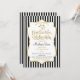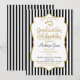 Um convite elegante à festa de formatura da Faculdade de Medicina, preto e dourado, com falso quadro de sotaque dourado e listras negras e brancas com texto dourado e preto e um estetoscópio. Um convite para formando da Faculdade de Medicina, bonito e elegante.