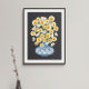 Um buquê encantador e alegre de flores brancas em um vaso curvo, azul, de médio. Adicione esta pop de felicidade no modo de médio a qualquer parede em sua casa ou dormitório!