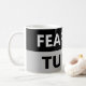 Uma caneca branca, prateada e preta, velha e velha, para um músico de tuba, com as palavras MEDO O TUBAS. Projetado por Heard_. Veja mais designs de música na minha loja do Zazzle, Heard_, aqui: https://bit.ly/3aGBOO6 #TubaPlayer #MúsicoMug #MusicMug #Tuba