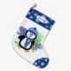 Esta estocagem de Feriado para um menininho mostra uma imagem de um pinguim adorável vestido com dois lenços de cachecol azul e chapéu de Papai Noel, e segurando uma bengala vermelha e branca listrada. Por trás da imagem do pinguim está um abstrato de cor d'água colorida design em azul, aqua e verde limão. Uma borda de padrão de flocos de neve azul e branco correspondente está no topo e no dedo. O nome do seu filho está em uma faixa branca de linha azul na borda superior do padrão do floco de neve. A parte de trás da estocagem é o mesmo padrão azul e branco do floco de neve.