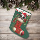Esta estocagem de Férias tem uma imagem de um adorável cachorrinho de Boston Terrier, tirando proveito de uma estocagem vermelha de ornamentado. A imagem está rodeada de bagas ocas, vermelhas, e poinsettia floresce, e é colocada sobre um fundo verde de Natal. Um design branco de borda escalada, bordado em vermelho, mantém seu nome personalizado no topo. A parte de trás da estocagem é idêntica à da frente.