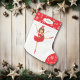 Aqui está um lindo feriado personalizado que qualquer garotinha que gosta de dança amará! A frente apresenta uma bailarina de cabelos escuros posando com um brilhante tutu vermelho de Natal. Ela veste uma coroa com um floco de neve branco, e pantufas de balé vermelho correspondentes. A imagem é colocada sobre um fundo branco, e o dedo e a borda superior são um padrão de floco de neve vermelho e branco correspondente. Na borda superior está um rótulo branco com o seu texto personalizado em verde. A parte de trás da estocagem é o mesmo padrão vermelho e branco de flocos de neve.