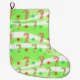 Uma meia natalícia alegre com uma design de doces festiva e colorida sobre um fundo verde e branco de aspecto retrovisor.