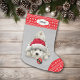 A frente desta estocagem de Feriado mostra uma imagem de um adorável cão de Terreiro Branco de West Highland vestindo um chapéu de Papai Noel. O Westie quer jogar, e descobriu um bulbo da árvore do Papai Noel. A imagem é colocada sobre um fundo de cinza prateada, e o dedo e a borda superior são um padrão vermelho e branco de floco de neve. Na borda superior está um rótulo branco com seu texto personalizado em cinzas escuras. A parte de trás da estocagem é o mesmo padrão vermelho e branco de flocos de neve.