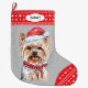 A frente desta estocagem de Férias mostra uma imagem de um Yorkshire Terrier vestindo um chapéu de Papai Noel. A imagem é colocada sobre um fundo de cinza prateada, e o dedo e a borda superior são um padrão vermelho e branco de floco de neve. Na borda superior está um rótulo branco com seu texto personalizado em cinzas escuras. A parte de trás da estocagem é o mesmo padrão vermelho e branco de flocos de neve.