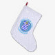 Designon a Christmas stocking shows a grey haired angel wearing the flag of Greece to honor all Greek yiayia's (grandmother's). Above reads, in blue circular letters, GREEK YIAYIA ANGEL. Below, a place for a name, also in blue circular letters. The angel flies in the center of a blue circle. A white, textured background of squiggly squares surrounds it all.