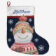 Esta meia de Natal personalizada apresenta um bonitinho bonitinho vestindo um suéter vermelho, azul e de ouro em um fundo azul de burlap com flocos de neve. Uma faixa vermelha de burlap na parte superior delimitada pelo branco tem um nome na tipografia azul, escrita à mão, para você personalizar. Projetada por Susan Coffey.