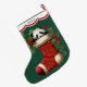 Essa estocagem de Férias tem uma imagem de um adorável bebê panda ursinho espiando uma estocagem vermelha ornamentado. A imagem está rodeada de bagas ocas, vermelhas, e poinsettia floresce, e é colocada sobre um fundo verde de Natal. Um design branco de borda escalada, bordado em vermelho, mantém seu nome personalizado no topo. A parte de trás da estocagem é idêntica à da frente.