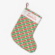 Esta meia divertida tem uma ilustração colorida e divertida de tons vermelhos e verdes que leem "Happy" e "Holidays" nos rótulos. No topo da estocagem está uma área branca vermelha esboçada onde você pode digitar seu nome para uma estocagem personalizada!