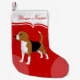 Meia de Natal Personalizada para Cachorro Beagle: Esta meia de natal personalizada é perfeita para amantes de Beagle. A meia vermelha tem uma faixa branca impressa com texto em letra cursiva vermelha para você personalizar. O desenho do cão apresenta um cão Beagle marrom, preto e branco em pé, alerta e orgulhoso.