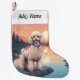 Cachorro Poodle sentado ao lado de um lago ao pôr do sol. Adicione esta imagem a outros produtos. Adicione seu próprio texto também. Muitos animais de estimação nas minhas lojas.