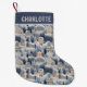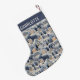 Bordado Natal Snowy Winter Homes Faux Embroidery Embroidery Personalised Name Christmas Stocking apresenta um padrão falso azul, bege e bordado branco para casas de inverno com neve com seu nome personalizado. Criado por feriados Evco www.zazzle.com/store/evcoholidays