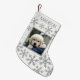 Crie a sua foto personalizada de natal para as crianças ou seus animais de estimação com este divertido design de floco de neve prateado. Adicione a foto do seu filho, do gato ou do cão à falsa borda da falso cintilação prateada no centro da estocagem. A sala acima dos falso falso flocos de neve com brilho prateado permite texto personalizado para que você possa adicionar um nome. O fundo de textura branca macia e de madeira de cinza adiciona um toque de calor rústico a esta estocagem de Natal personalizada decorada num padrão de floco de neve prateado.