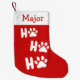 Personalize este Ho Ho Ho Ho festivo, reserva de Natal vermelha e branca para o seu cão! O texto personalizado Ho, Ho, Ho tem impressões de pata de cão para a letra O em branco. Você pode alterar o estilo de tipo da letra "H", ajustar o tamanho de cada motivo, mover elementos ao redor e escolher uma cor de fundo diferente. O lado inverso deste estoque de cães tem um fundo vermelho e um bloco de cor de punho branco. Esta meia de Natal divertida e única é perfeita para qualquer cão!