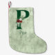 O design de férias bonito e festivo apresenta a letra maiúscula P com enchimento de shimmer verde e embelezado com flores de inverno e buquê de aquarelas foliage sobre fundo de harlequin verde escamoteado. Personalizar com nome ou outra mensagem