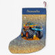 Monster Truck Flames Glitter Background, featuring a high-powered monster truck with blazing orange flames on a bold blue and gold glitter backdrop. This personalized holiday décor brings action-packed energy to your custom Christmas decoration. Personalize it with a name, nickname, racing slogan, or holiday message to create a one-of-a-kind gift for truck fans, kids, or adrenaline lovers. The combination of metallic sparkle and fiery design makes this stocking a standout piece for any festive setup.