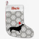 Estocagem de Natal com um padrão de flocos de neve de feriado e uma silhueta preta de dachshund vestindo um chapéu de Papai Noel com o nome do seu animal de estimação em um roteiro vermelho.