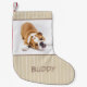 Foto personalizada de cão e nome de estocagem de Natal. Seu cachorro ou qualquer outro animal de estimação vai adorar esta meia de Natal divertida personalizada apenas para ele. Insira a foto do seu cachorro e personalize-a com o nome dos animais de estimação. A estocagem é bege com listras brancas - isso a faz parecer festiva e na moda. Muito espaço para guloseimas.