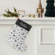 Meia de natal preta e branca moderna e elegante apresenta um padrão de floco de neve com seu nome ou monograma no topo em letras de caligrafia branca.