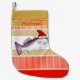 Por favor o entusiasta da pesca de esportes esta época natalícia com esta meia que caracteriza uma truta salpicada (speck) que donning um chapéu do papai noel em um vermelho do divertimento e em um design do Natal do ouro. Personalize com o nome de sua escolha.