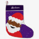 Um nome personalizável para a estocagem de Natal com Papai Noel de cor castanha, vestindo um chapéu vermelho e branco. Ele está sorrindo enquanto olha de frente a um fundo roxo.