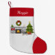 A ilustração original do desenho de Destei de um adorável cão da raça Dachshund, preto de cabelo longo e casaco de tom. O cão é colocado numa sala festiva que tem uma lareira e muitas decorações de Natal, incluindo uma árvore de Natal verde, algumas meias vermelhas e uma coroa com um arco vermelho. Há também uma área de texto personalizável para um nome. O topo e o fundo têm alguma cor vermelha enquanto a cor de fundo geral é uma cinza muito clara.