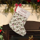 Esta estocagem personalizada de Natal apresenta um padrão de pinecones, boughs de pínus e outros galhos verdes, e groselhas vermelhas e entrelaçadas em um fundo branco. No topo está a elegante caligrafia de roteiro Feliz Natal com modelo de nome personalizável. Verifique a coleção de muitos produtos correspondentes ou entre em contato comigo através do Zazzle Chat se você quiser produtos adicionais correspondentes ou outras formas de cores.