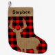 Veado grande sobre fundo de xadrez de lenhador. Adicione um nome personalizado ao painel superior de burlap.