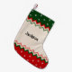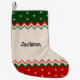 Personalized name Christmas stockings everyone can enjoy. Featuring a red, green, and off white pattern design with snowflakes.