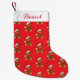 Esta meia de Natal é mostrada em vermelho com uma estampa de urso de pelúcia fofa e um nome personalizado no topo.